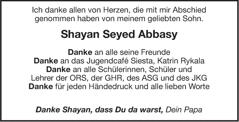 Hier finden Sie alle Traueranzeigen aus der Zeitung, die bisher für Shayan Seyed Abbasy erschienen sind. Weitere Traueranzeigen, die in der Zeitung erscheinen, werden hier ebenfalls aufgelistet