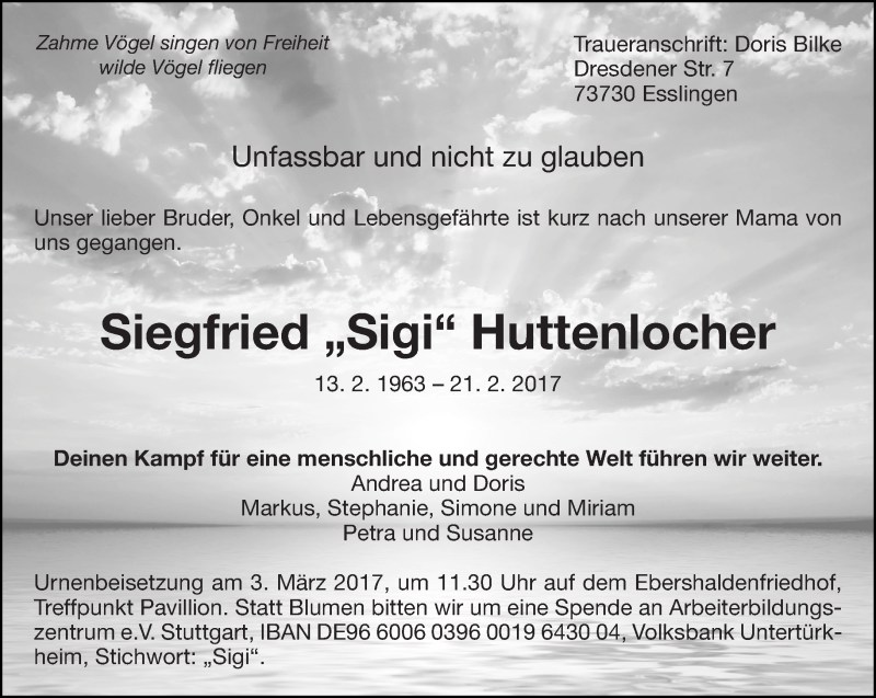 Hier finden Sie alle Traueranzeigen aus der Zeitung, die bisher für Siegfried Huttenlocher erschienen sind. Weitere Traueranzeigen, die in der Zeitung erscheinen, werden hier ebenfalls aufgelistet