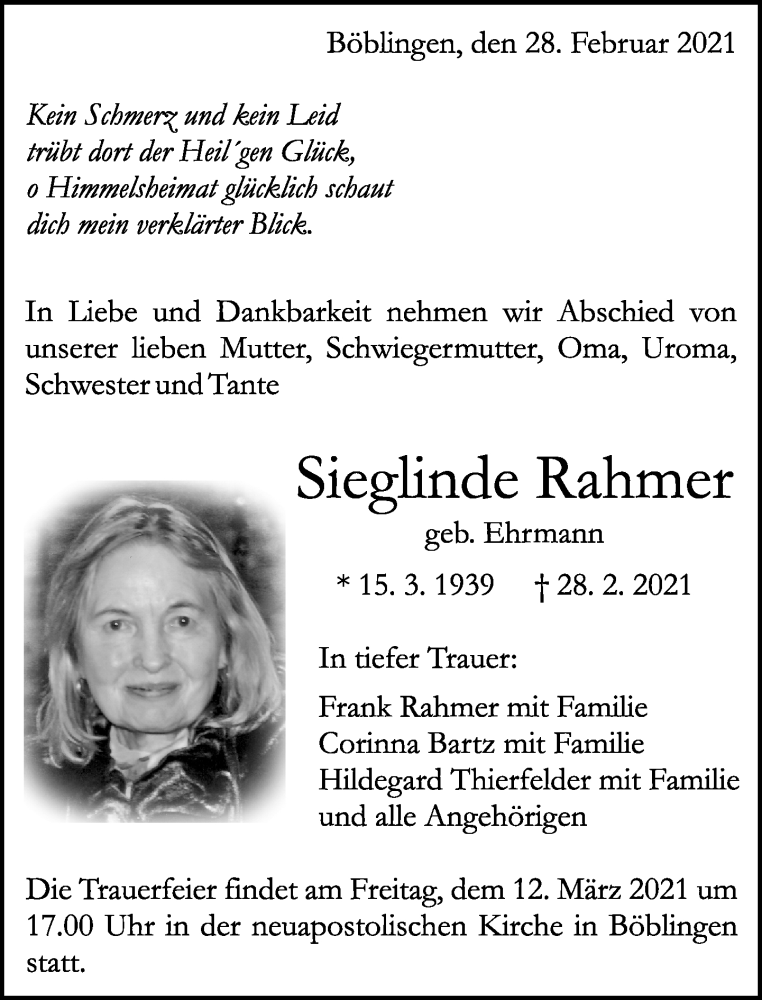 Hier finden Sie alle Traueranzeigen aus der Zeitung, die bisher für Sieglinde Rahmer erschienen sind. Weitere Traueranzeigen, die in der Zeitung erscheinen, werden hier ebenfalls aufgelistet
