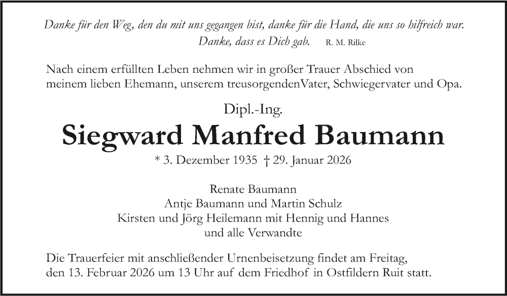 Hier finden Sie alle Traueranzeigen aus der Zeitung, die bisher für Siegward Manfred Baumann erschienen sind. Weitere Traueranzeigen, die in der Zeitung erscheinen, werden hier ebenfalls aufgelistet