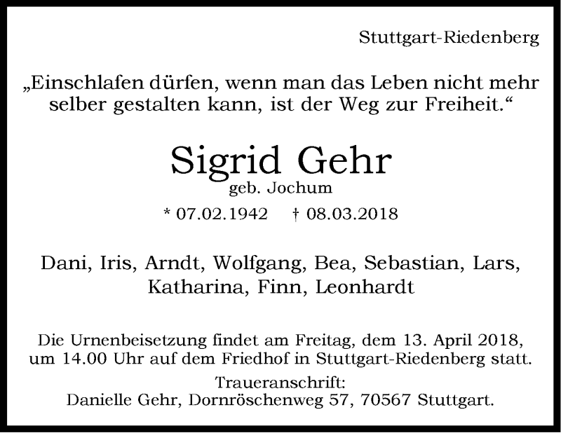 Hier finden Sie alle Traueranzeigen aus der Zeitung, die bisher für Sigrid Gehr erschienen sind. Weitere Traueranzeigen, die in der Zeitung erscheinen, werden hier ebenfalls aufgelistet
