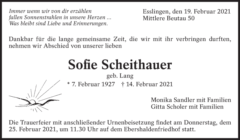 Hier finden Sie alle Traueranzeigen aus der Zeitung, die bisher für Sofie Scheithauer erschienen sind. Weitere Traueranzeigen, die in der Zeitung erscheinen, werden hier ebenfalls aufgelistet