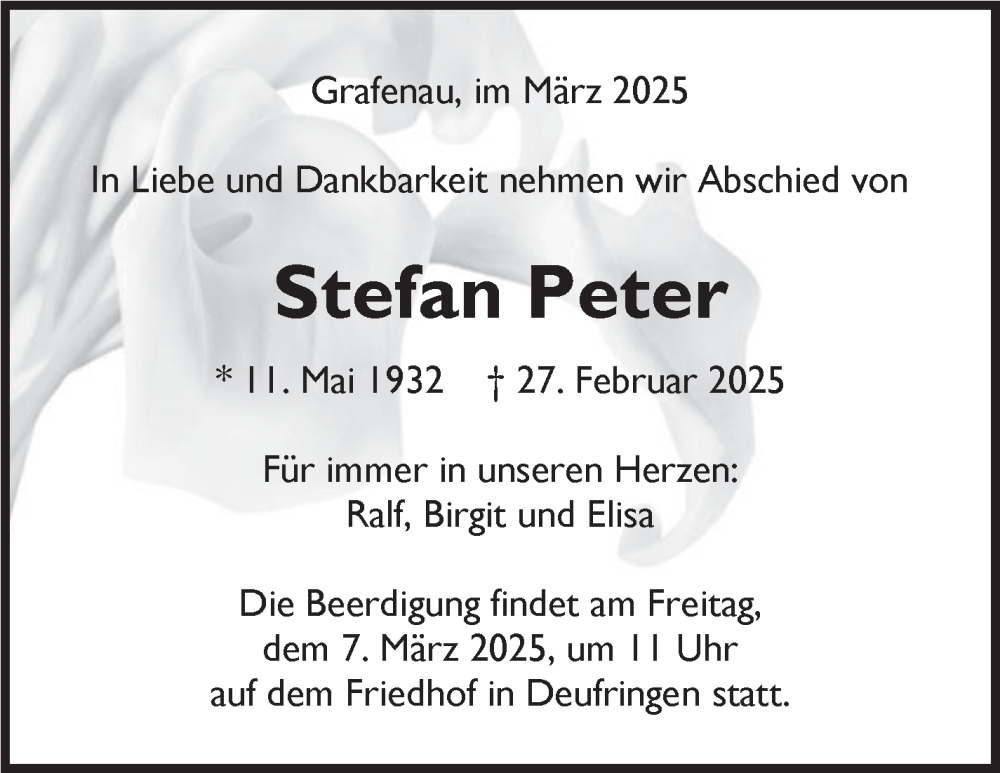 Hier finden Sie alle Traueranzeigen aus der Zeitung, die bisher für Stefan Peter erschienen sind. Weitere Traueranzeigen, die in der Zeitung erscheinen, werden hier ebenfalls aufgelistet