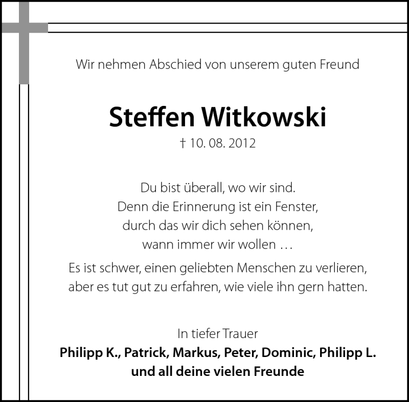 Hier finden Sie alle Traueranzeigen aus der Zeitung, die bisher für Steffen Witkowski erschienen sind. Weitere Traueranzeigen, die in der Zeitung erscheinen, werden hier ebenfalls aufgelistet