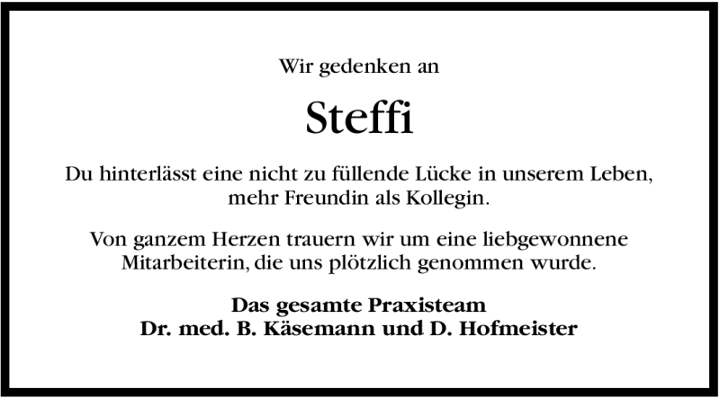 Hier finden Sie alle Traueranzeigen aus der Zeitung, die bisher für Steffi erschienen sind. Weitere Traueranzeigen, die in der Zeitung erscheinen, werden hier ebenfalls aufgelistet