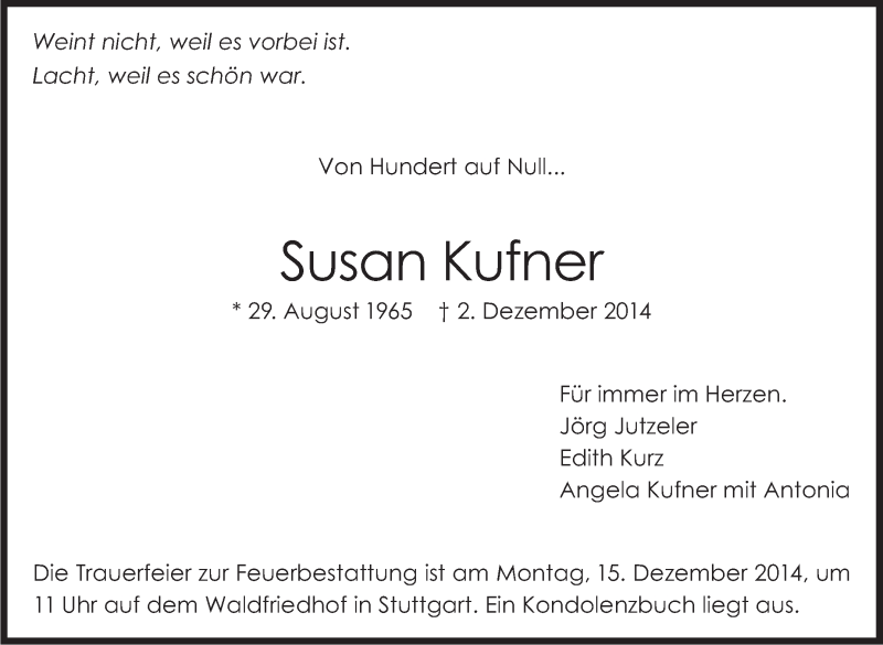 Hier finden Sie alle Traueranzeigen aus der Zeitung, die bisher für Susan Kufner erschienen sind. Weitere Traueranzeigen, die in der Zeitung erscheinen, werden hier ebenfalls aufgelistet