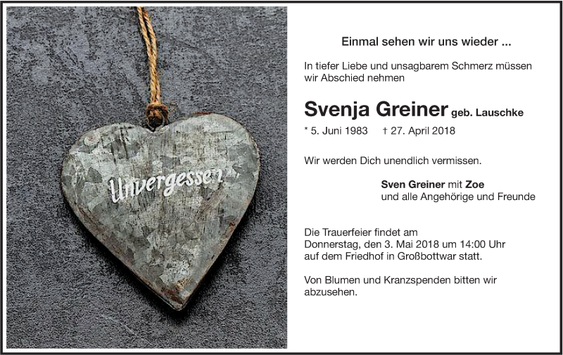 Hier finden Sie alle Traueranzeigen aus der Zeitung, die bisher für Svenja Greiner erschienen sind. Weitere Traueranzeigen, die in der Zeitung erscheinen, werden hier ebenfalls aufgelistet