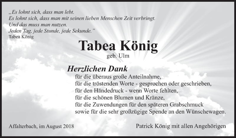 Hier finden Sie alle Traueranzeigen aus der Zeitung, die bisher für Tabea König erschienen sind. Weitere Traueranzeigen, die in der Zeitung erscheinen, werden hier ebenfalls aufgelistet