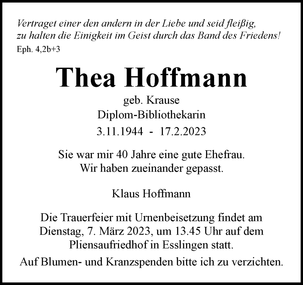 Hier finden Sie alle Traueranzeigen aus der Zeitung, die bisher für Thea Hoffmann erschienen sind. Weitere Traueranzeigen, die in der Zeitung erscheinen, werden hier ebenfalls aufgelistet