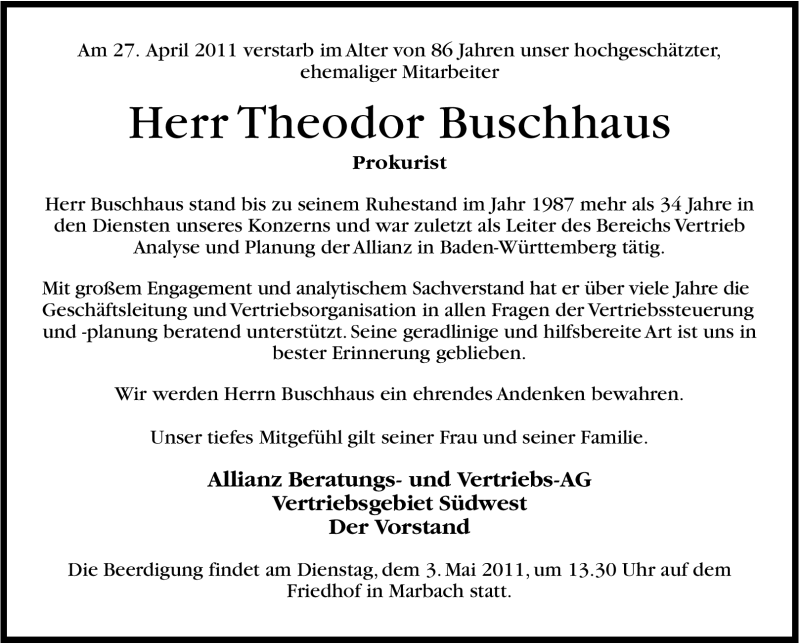Hier finden Sie alle Traueranzeigen aus der Zeitung, die bisher für Theodor Buschhaus erschienen sind. Weitere Traueranzeigen, die in der Zeitung erscheinen, werden hier ebenfalls aufgelistet