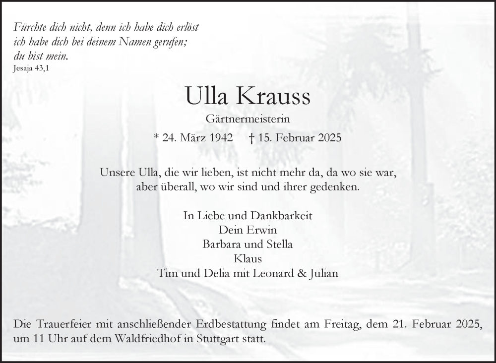 Hier finden Sie alle Traueranzeigen aus der Zeitung, die bisher für Ulla Krauss erschienen sind. Weitere Traueranzeigen, die in der Zeitung erscheinen, werden hier ebenfalls aufgelistet