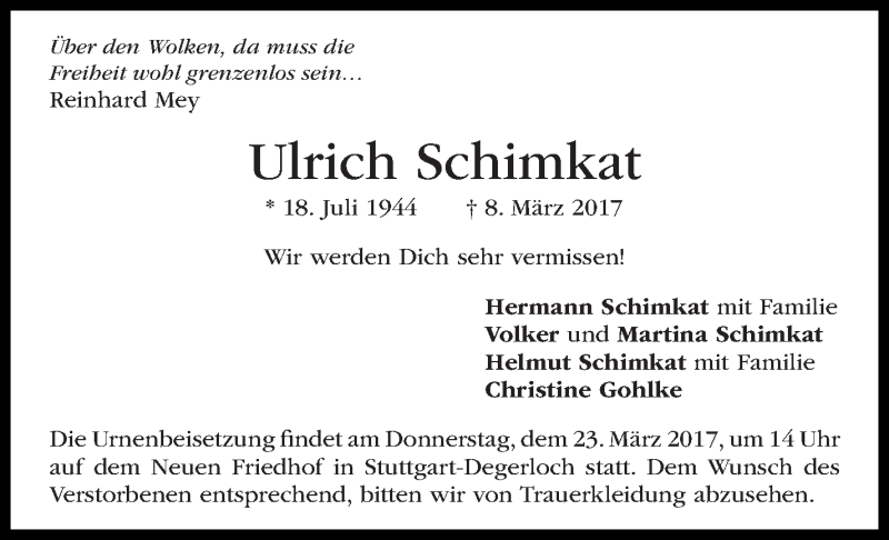 Hier finden Sie alle Traueranzeigen aus der Zeitung, die bisher für Ulrich Schimkat erschienen sind. Weitere Traueranzeigen, die in der Zeitung erscheinen, werden hier ebenfalls aufgelistet
