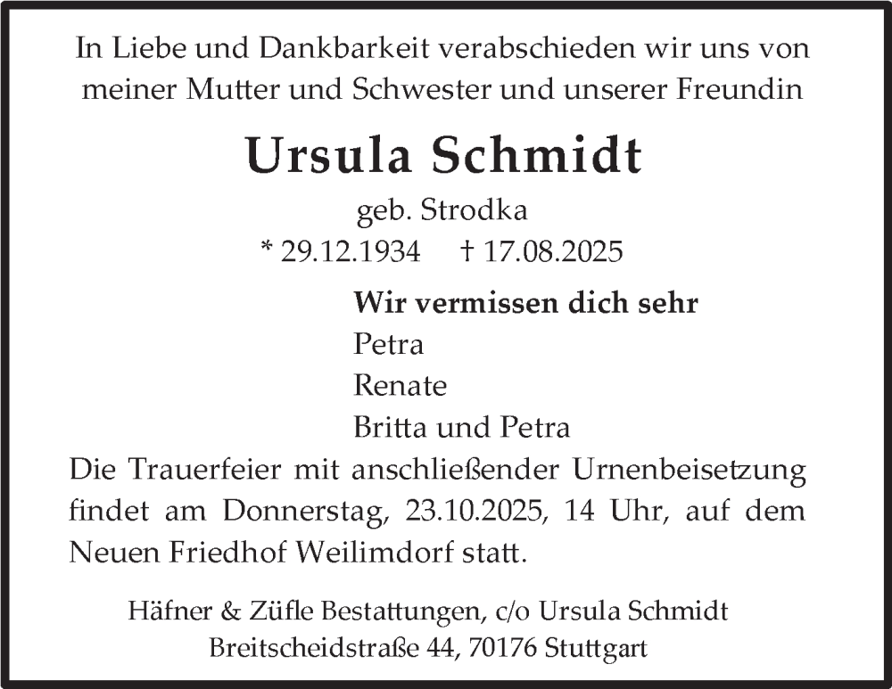 Hier finden Sie alle Traueranzeigen aus der Zeitung, die bisher für Ursula Schmidt erschienen sind. Weitere Traueranzeigen, die in der Zeitung erscheinen, werden hier ebenfalls aufgelistet