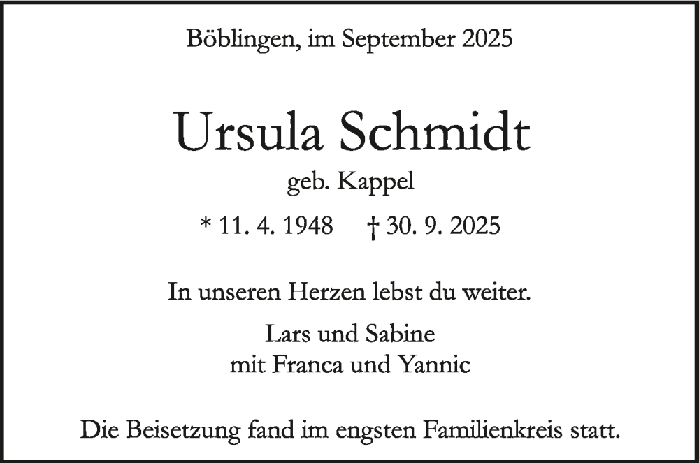 Hier finden Sie alle Traueranzeigen aus der Zeitung, die bisher für Ursula Schmidt erschienen sind. Weitere Traueranzeigen, die in der Zeitung erscheinen, werden hier ebenfalls aufgelistet