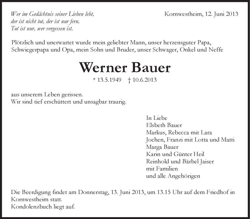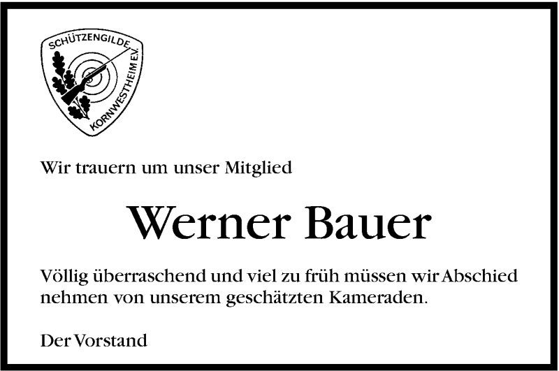 Hier finden Sie alle Traueranzeigen aus der Zeitung, die bisher für Werner Bauer erschienen sind. Weitere Traueranzeigen, die in der Zeitung erscheinen, werden hier ebenfalls aufgelistet