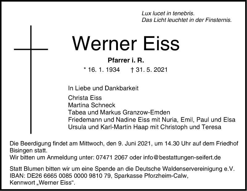 Hier finden Sie alle Traueranzeigen aus der Zeitung, die bisher für Werner Eiss erschienen sind. Weitere Traueranzeigen, die in der Zeitung erscheinen, werden hier ebenfalls aufgelistet