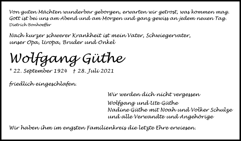 Hier finden Sie alle Traueranzeigen aus der Zeitung, die bisher für Wolfgang Güthe erschienen sind. Weitere Traueranzeigen, die in der Zeitung erscheinen, werden hier ebenfalls aufgelistet