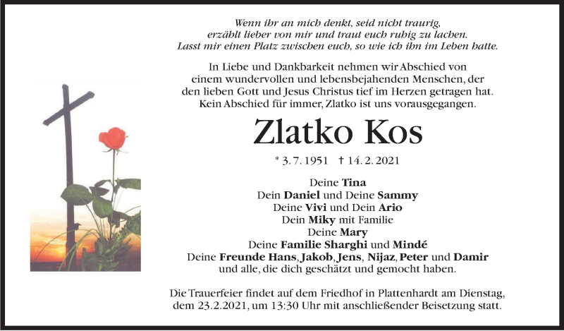 Hier finden Sie alle Traueranzeigen aus der Zeitung, die bisher für Zlatko Kos erschienen sind. Weitere Traueranzeigen, die in der Zeitung erscheinen, werden hier ebenfalls aufgelistet